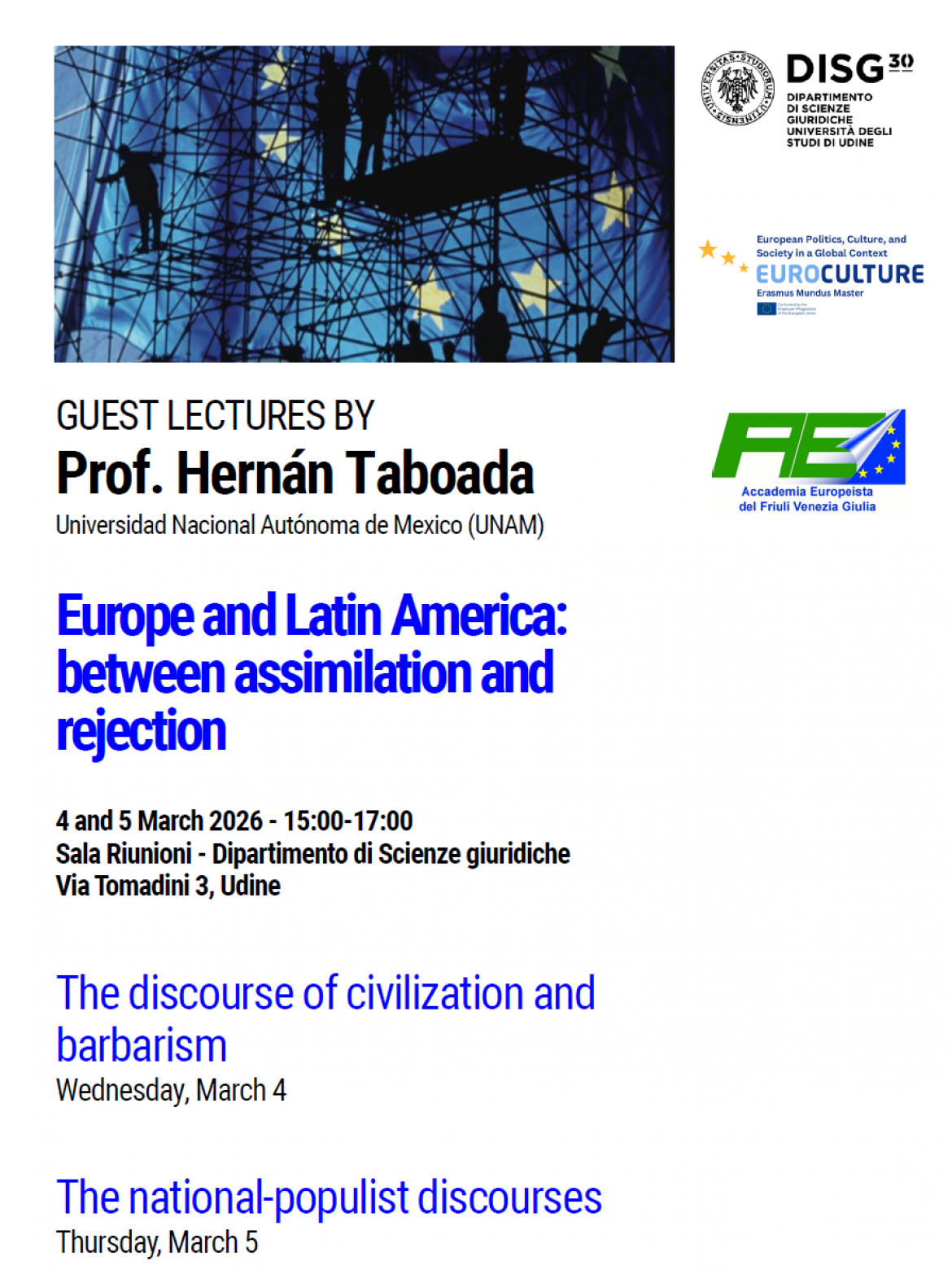 L’Accademia Europeista del Friuli Venezia Giulia ha il piacere di segnalarvi le due lectures del Prof. Hernán Taboada della Universidad Nacional Autónoma de Mexico (UNAM) sul rapporto tra Europa e America Latina. L’evento avrà luogo all’Università di Udine, Sala Riunioni – Dipartimento di Scienze giuridiche, via Tomadini 3, Udine.