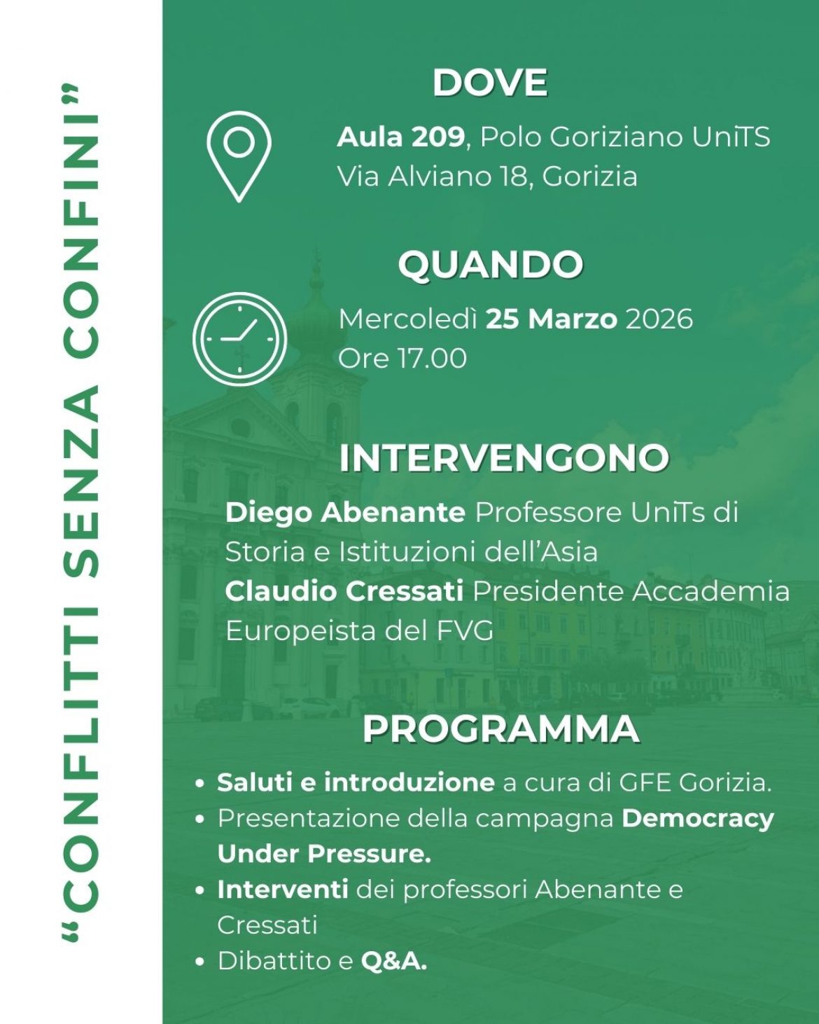 Nella settimana dal 18 al 25 marzo si svolge la campagna Democracy Under Pressure, il cui tema quest’anno sarà, su scala europea, la guerra ibrida. Il Movimento Federalista Europeo – Sezione di Gorizia parteciperà all’iniziativa, mercoledì 25 alle 17.00, con un intervento del prof. Diego Abenante e del prof. Claudio Cressati, all’interno dell’incontro “Conflitti senza Confini”.